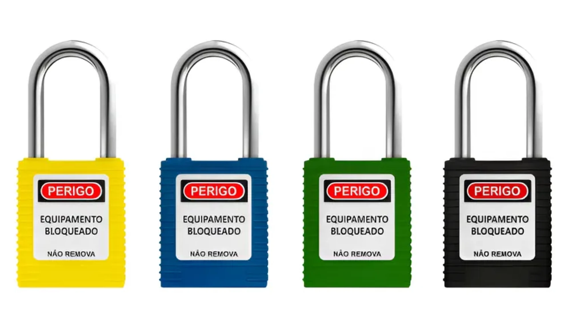 Desenvolvidos para atender as normas de segurança NR12, com corpo resistente e identificação colorida, usados em manutenção industrial e segurança de máquinas.